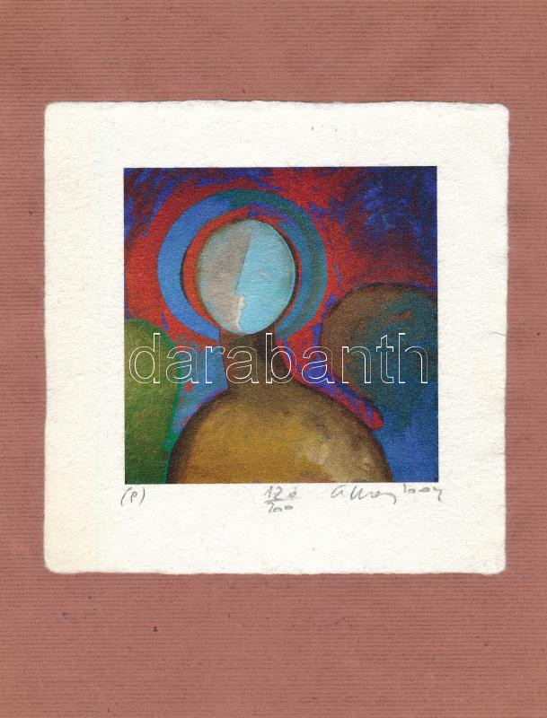 Beschreibung: Aknay János (1949- ): Angyal. Computer print, merített papír. Jelzett, számozott: 120./200. Lapra kasírozva, 10x10 cm