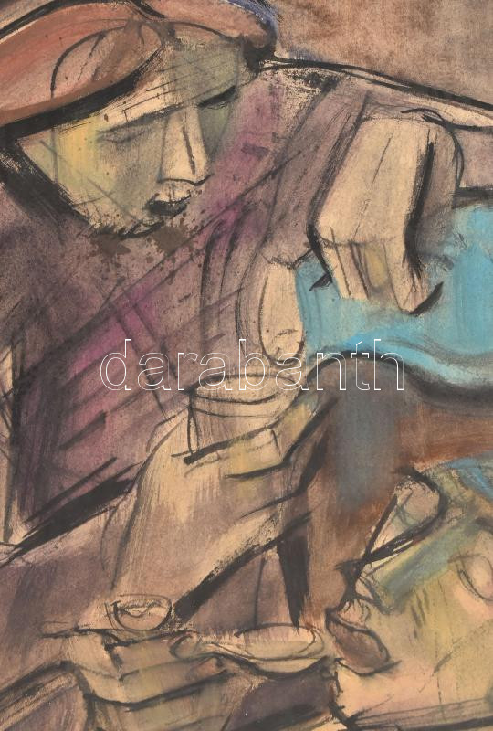 Hetényi Tibor (1891-1977): Ebédelők. Akvarell, tus,, papír, jelzés nélkül, kissé sérült, paszpartuban, hátoldalán feliratozott, 57x37,5 cm