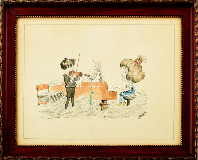 Beschreibung: Kállai (Kállay) Lujza (1871-1960): A zongorista és a hegedűs (karikatúra), 1924. Akvarell, tus, papír. Jelezve jobbra lent. Üvegezett fakeretben. 23x30 cm