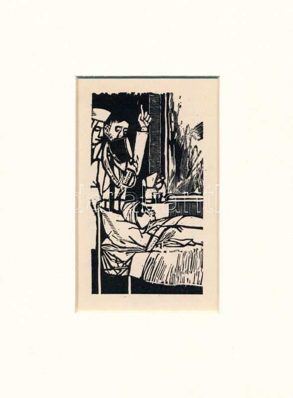 Beschreibung: Kondor Béla (1931-1972): Vizit, fametszet, papír, jelzés nélkül, paszpartuban, 10×6 cm