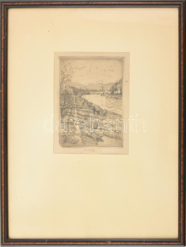 Beschreibung: Lénárd Lévy Róbert (1879-1936): Vízparti táj. Rézkarc, papír. Jelzett. 15,5x11,5 cm. Üvegezett fakeretben.