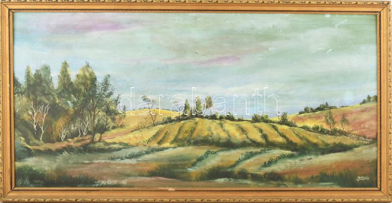 Beschreibung: Marosán László (1955-): Dombos táj. Olaj, farost, jelzett. Dekoratív, kissé sérült fakeretben, 40x80 cm
