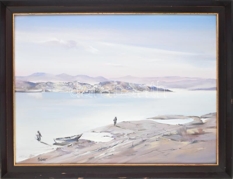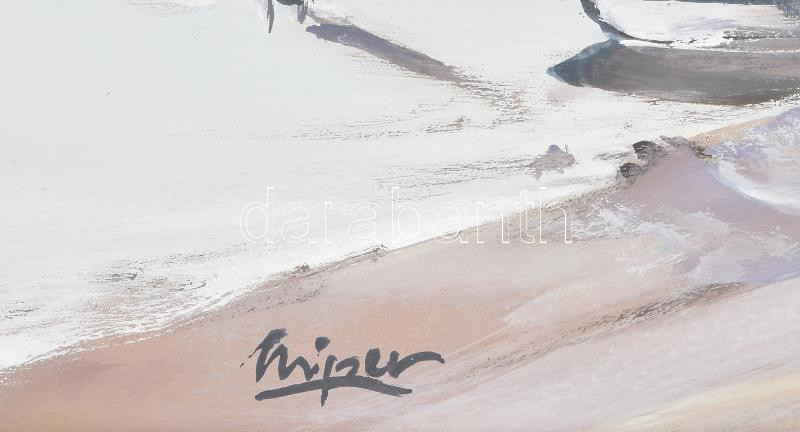 Beschreibung: Mizser Pál (1941-): Halászok. Tempera, farost, jelzett , kissé sérült fakeretben, 60x90 cm