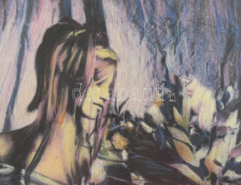 Beschreibung: Molnár Zoltán (1937-2001): Életkép (Lány csokorral). Akvarell, selyem, jelzett, üvegezett fa keretben, 60x50 cm