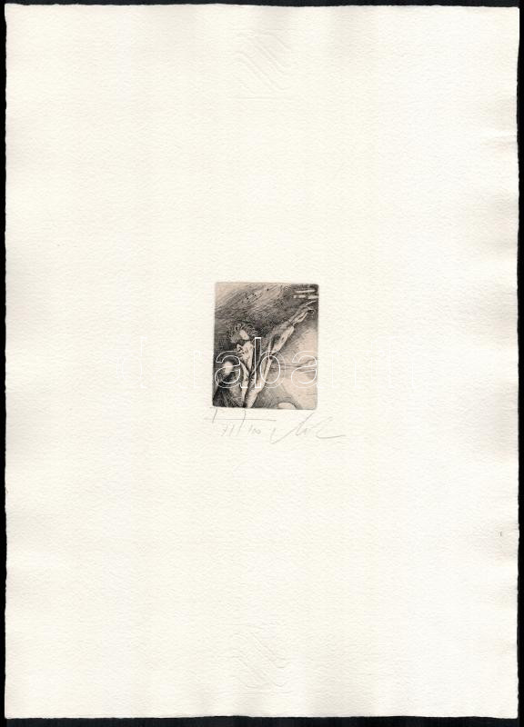 Beschreibung: Müller Árpád (1961-2006): Asztronómus. Rézmetszet, merített papír, jelzett, 71/100 számozással. 7×6 cm.