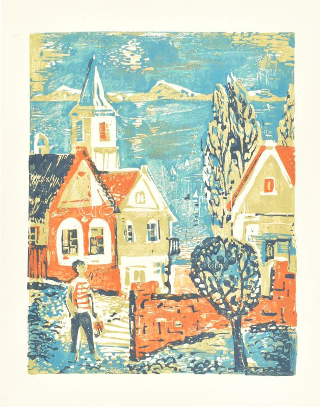 Beschreibung: Rác András (1926-2013): Balatongyörök. Színes linómetszet, papír, jelzés nélkül, 35×28 cm