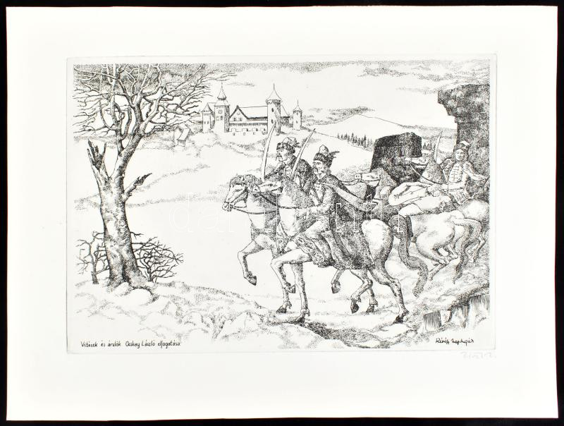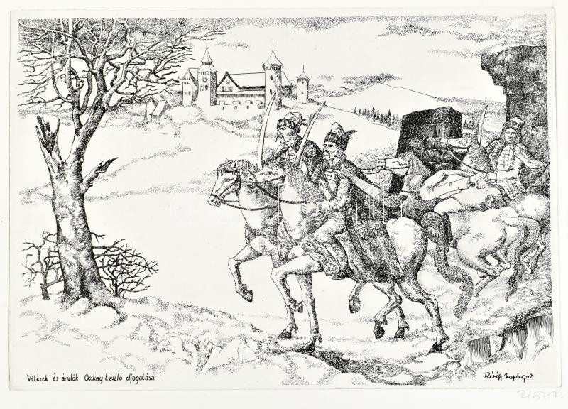 Beschreibung: Révész Napsugár (1944-): Vitézek és árulók. Ocskay László elfogatása. Rézkarc, papír, jelzett, 29x20 cm