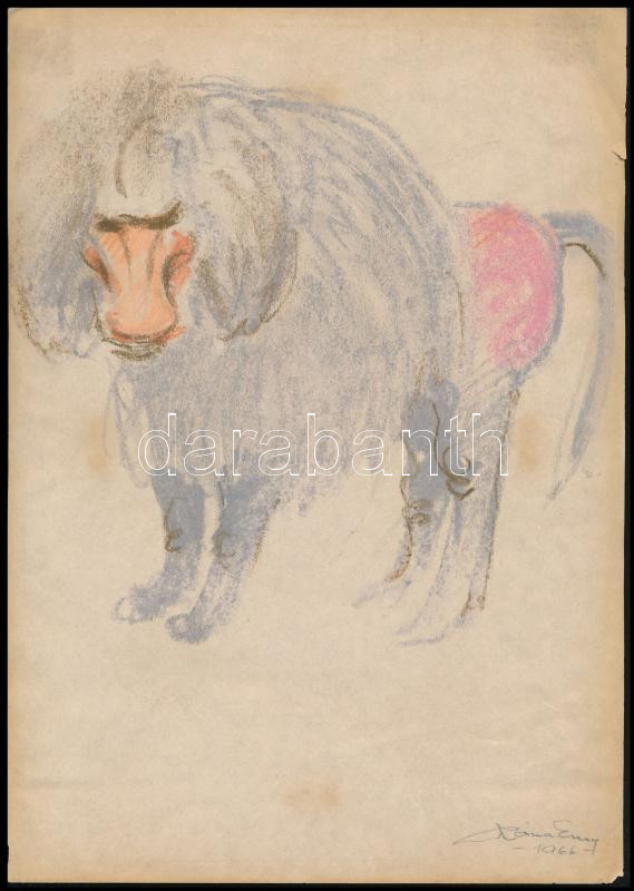Beschreibung: Róna Emy (1904-1988): Majom, 1966. Kréta, papír, jelezve jobbra lent, apró lapszéli sérülésekkel, 29,5x21 cm