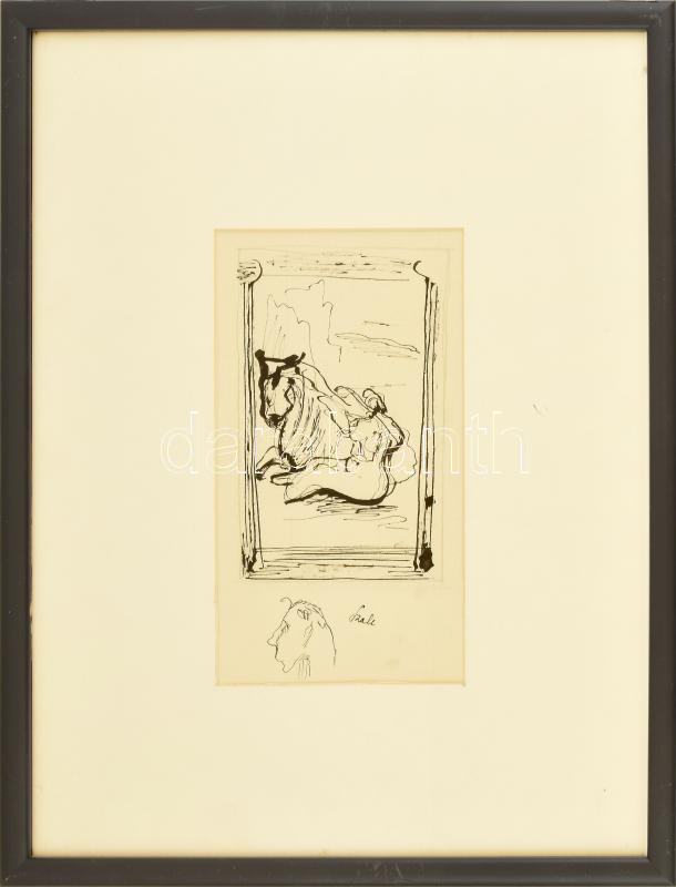 Szalay Lajos (1909-1995): Jelenet. Tus, papír, jelzés nélkül. Sümegi György művészettörténész szakvéleményével. Dekoratív, üvegezett fakeretben. 23×12,5 cm.