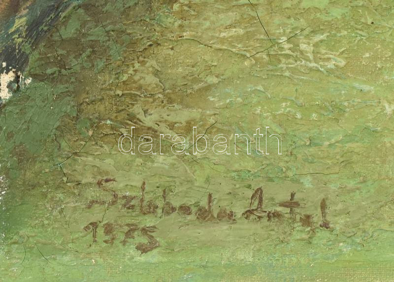 Beschreibung: Szloboda Antal (1911-2011): Dunapart Dunaújvárosnál, 1970-es évek. Olaj, vászon, jelezve balra lent, apró sérülésekkel, 50×70 cm
