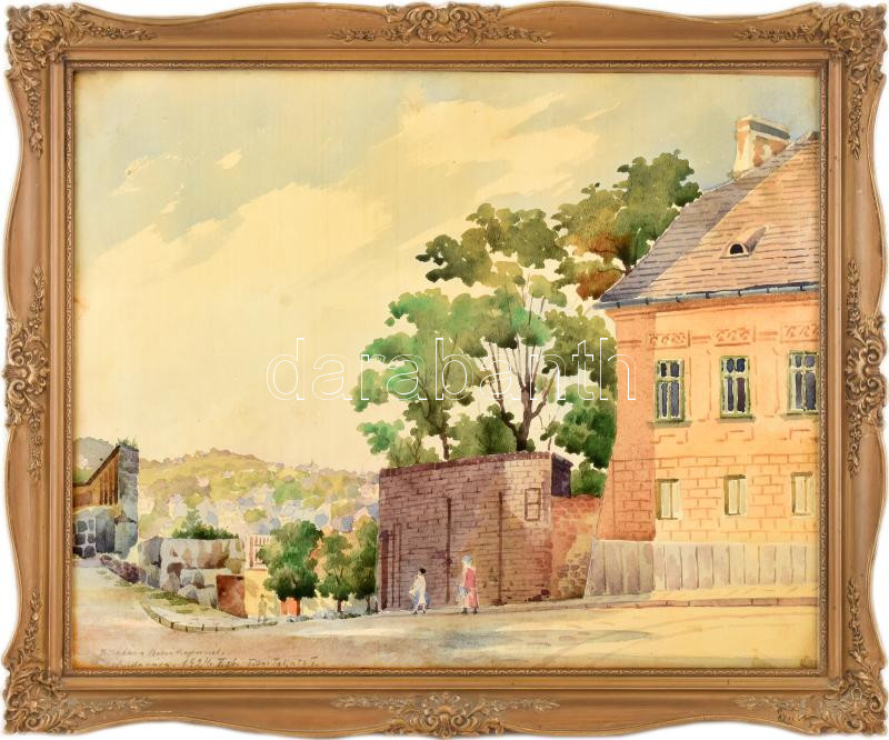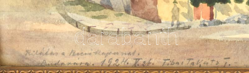 Tibai Takáts János (1876-1943): Kilátás a Bécsi kapunál, Budavára, 1924. Akvarell, papír, jelezve balra lent. Dekoratív, üvegezett fakeretben, hátoldalán Hoffmann Ferencz képkereskedő és keretező 1930 körüli címkéjével. 40x50 cm.