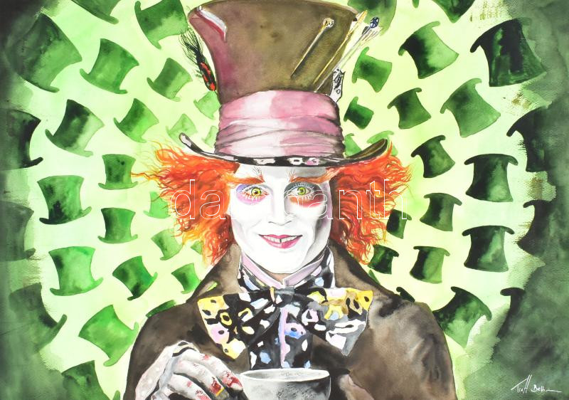 Beschreibung: Tieff Bettina (-): Kalapos - Aliz Csodaországban. Akvarell, papír, jelzett, 50x70 cm