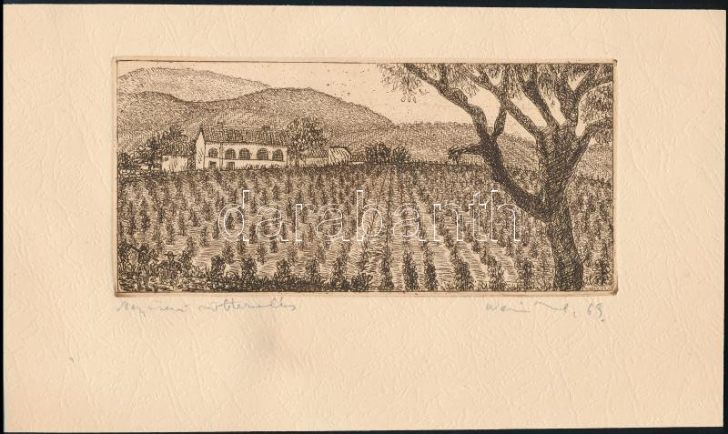 Beschreibung: Weisz Zsuzsa (1925-2017): Nagyüzemi bortermelés. Rézkarc, papír, jelzett, lap széle körbevágva, 10×20 cm. Magyar borvidékek c. mappából.