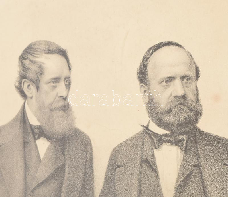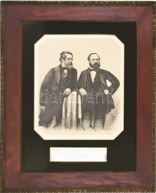 Kossuth Lajos és Ihász Dániel 1872. Litográfia, papír. Pesten, Heckenast Gusztáv tulajdona. Stereoscop után élethűen tálalva. Nyom. Reiffenstein és Rösch Bécsben. Foltos. Kissé sérült. 41x34 cm. Üvegezett fakeretben. Ritka!