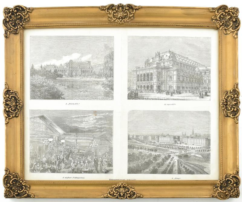 Beschreibung: ca 1870-90 Bécsvárosi képek. Rotációs fametszet, papír, részben jelzett a metszeten. 28x36 cm. Üvegezett, dekoratív fakeretben.