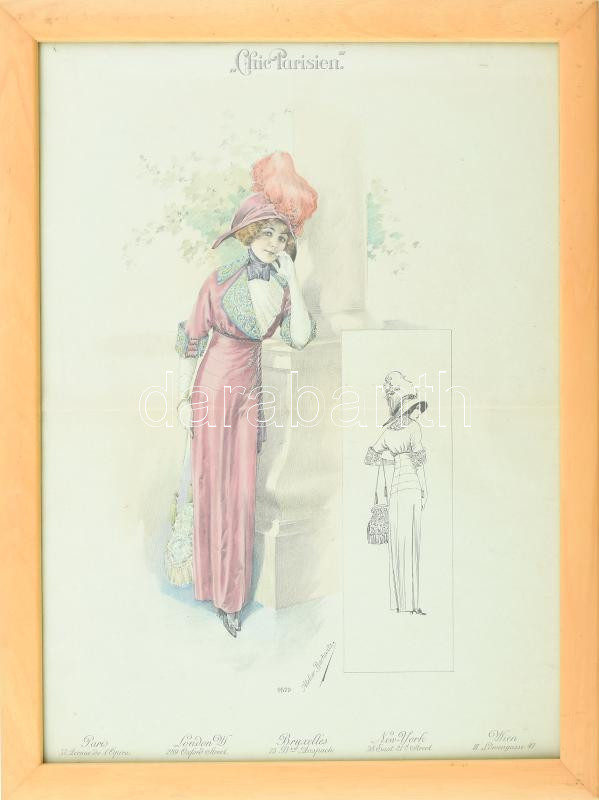 Beschreibung: cca 1900 "Chic Parisien", női divatkép. Színes litográfia, papír, Atelier Bachwitz. 39,5x29,5 cm. Üvegezett fakeretben.
