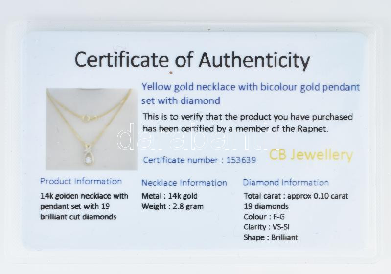 Beschreibung: 14K sárgaarany nyaklánc, 19 brill gyémánttal ékített függővel