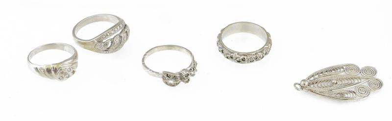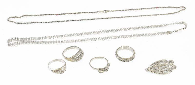 Beschreibung: 7 db ezüst (Ag) ékszer: gyűrűk (4 db), láncok (2 db), filigrán medál; össz. 34,2 g