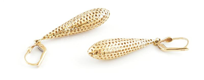 Beschreibung: Arany (Au) 14K áttört, csepp alakú fülbevalópár, jelzett, 5×0,9 cm, nettó: 3,3 g