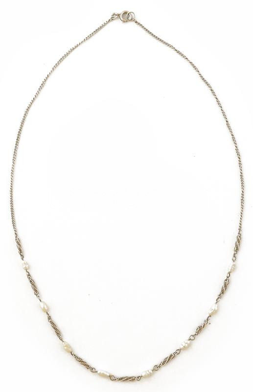 Beschreibung: Ezüst (Ag) nyaklánc tenyésztett gyöngyökkel, bruttó: 4,4 g, h: 47 cm
