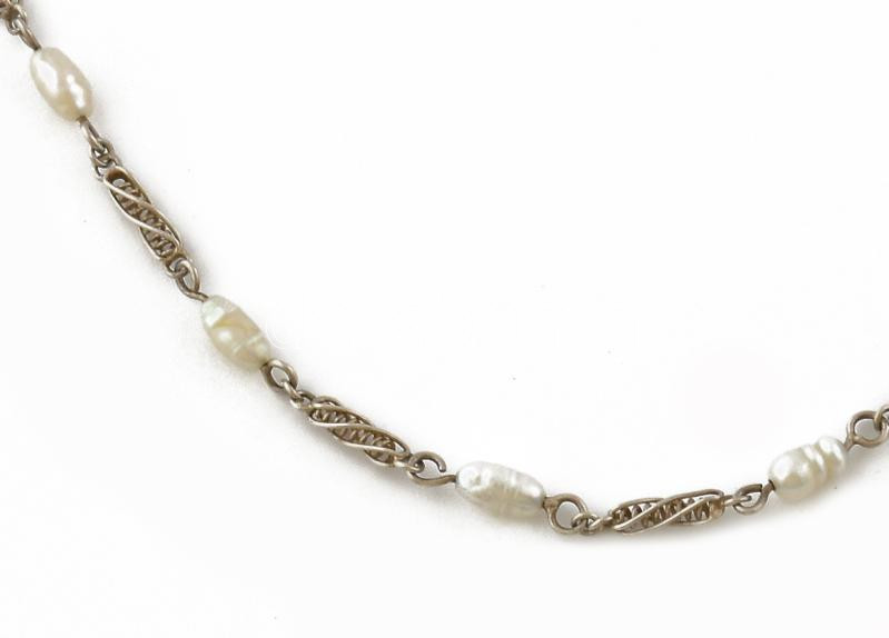 Ezüst (Ag) nyaklánc tenyésztett gyöngyökkel, bruttó: 4,4 g, h: 47 cm https://www.darabanth.com/de/444-Fernauktion/444.0/Juwellen-und-Kunstobjekte-aus-Edelmetall/Juwellen-und-Kunstobjekte-aus-Edelmetall~1500028/Ezust-Ag-nyaklanc-tenyesztett-gyongyokkel-brutto-4-4-g-h-47-cm~II2932253