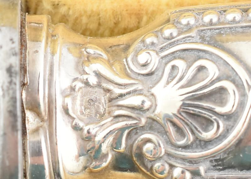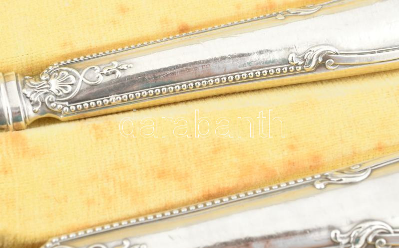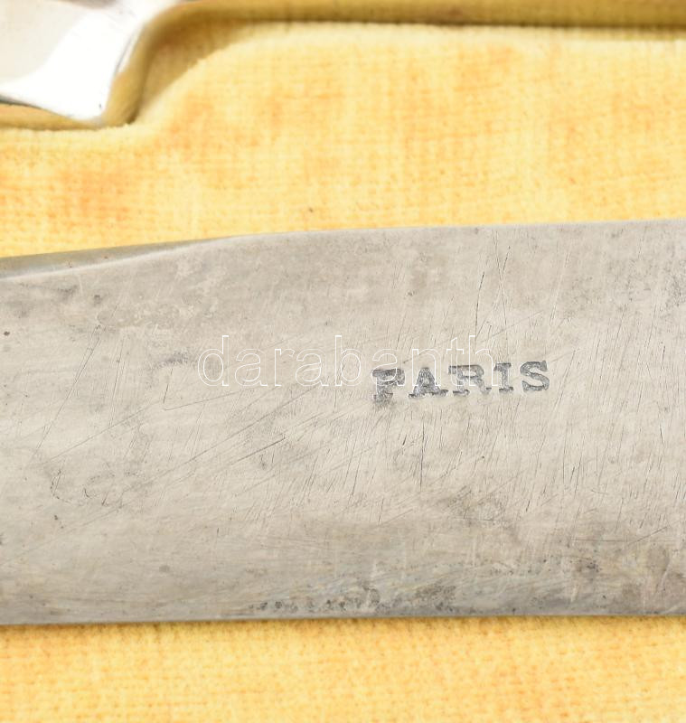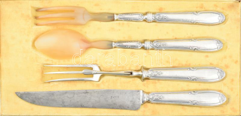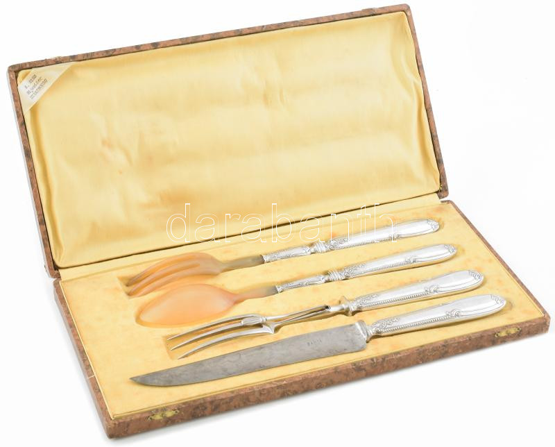Beschreibung: Ezüst (Ag) nyelű antik francia hús szervírozó és salátás készlet, jelzéssel, kissé sérült díszdobozban, h: 27-31 cm, bruttó: 325 g