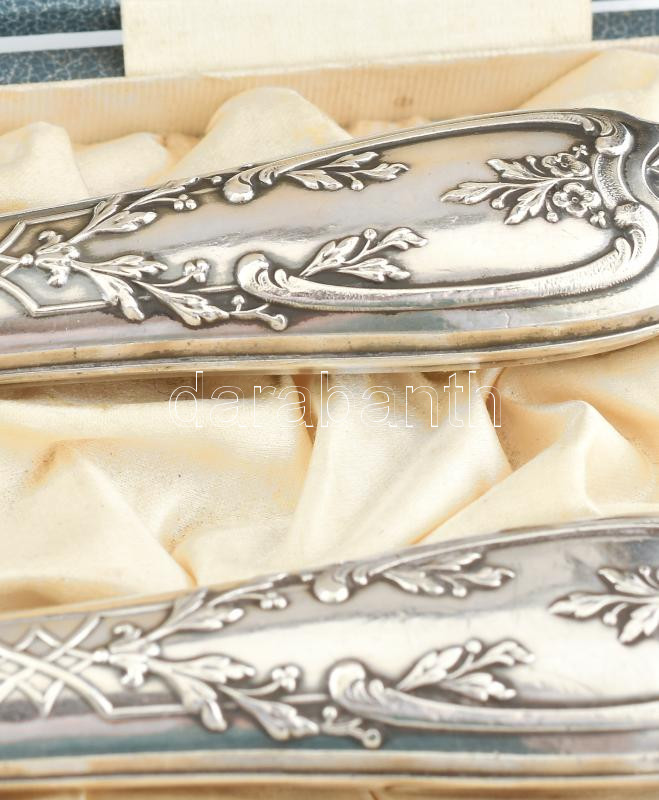 Ezüst (Ag) nyelű antik francia hús szervírozó készlet, jelzéssel, dísz... https://www.darabanth.com/de/444-Fernauktion/444.0/Juwellen-und-Kunstobjekte-aus-Edelmetall/Juwellen-und-Kunstobjekte-aus-Edelmetall~1500028/Ezust-Ag-nyelu-antik-francia-hus-szervirozo-keszlet-jelzessel-diszdobozban-h-27-31-cm-~II2930743
