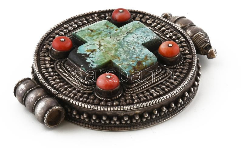 Beschreibung: Ezüst(Ag) amulett tartó türkiz és korall díszítéssel, jelzés nélkül, bruttó: 63,7 g