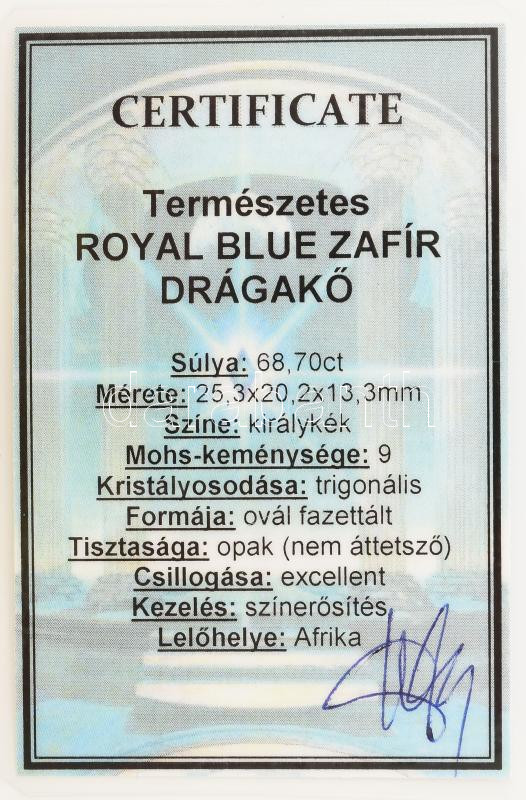 Beschreibung: Királykék zafír 68,7 ct ovál kaboson csiszolással, tanúsítvánnyal