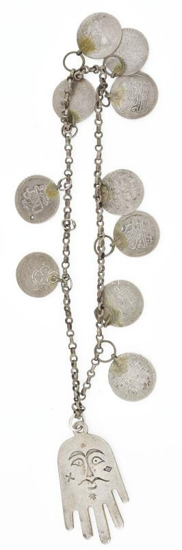 Beschreibung: Perzsa életfát ábrázoló, ezüst (Ag) nyaklánc, XIX. sz. korabeli ezüst pénzekkel, Farkasokat ábrázoló feliratos 52 g