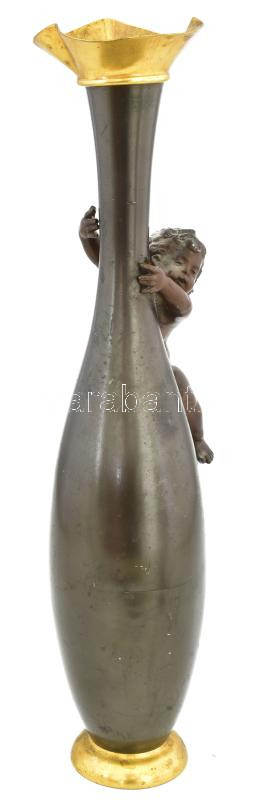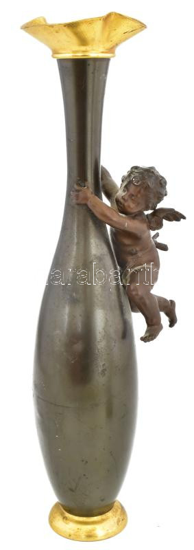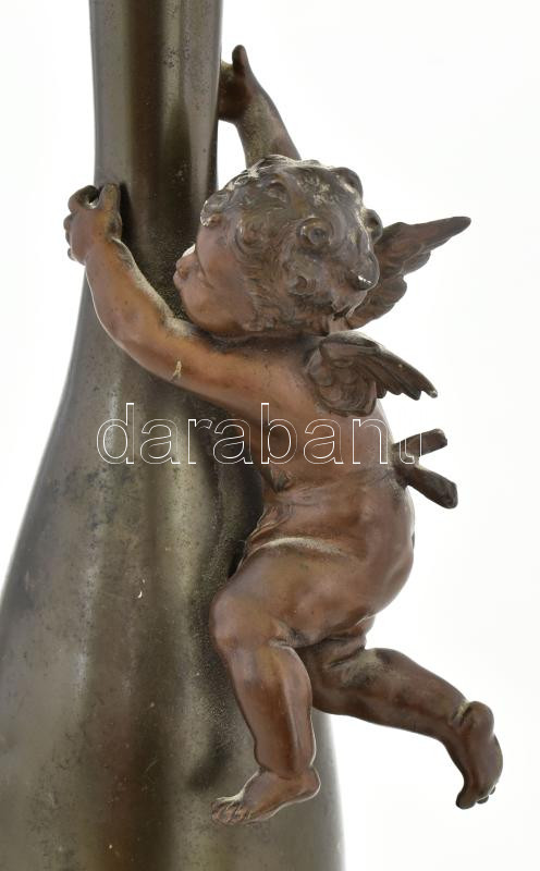 Beschreibung: Antik puttó figurával díszített bronz gyertyatartó, kis hiánnyal, kopással, m: 41 cm