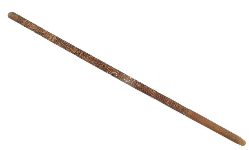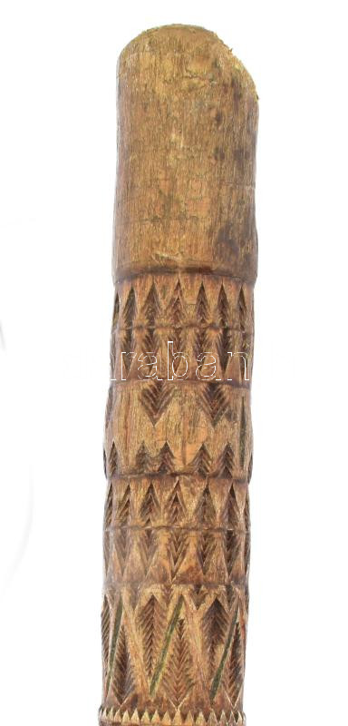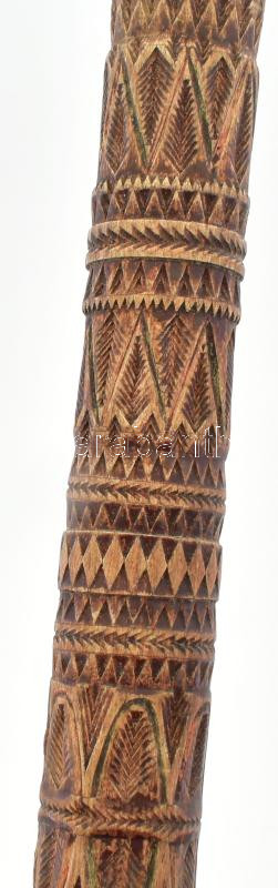 Fából faragott sétabot.gazdag díszítéssel, felső átmérő 2,5 cm, alsó vége felé enyhén keskenyedő, teljes hosszban ovális. A bot felületén 1mm-nél mélyebb mintázatok és kitöltések nincsenek. Feltűnően sok az azonos motívum, amelyeken formai-és méretarányos eltérés nincs.