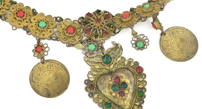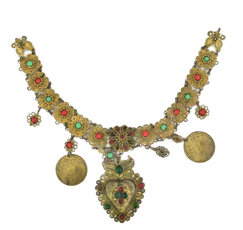 Keleti, török nyakék, réz, pénzekkel, kövekkel, h: 32 cm https://www.darabanth.com/de/444-Fernauktion/444.0/Kunst-Dokumente-andere-Sammelgebiete/Antik~500010/Keleti-torok-nyakek-rez-penzekkel-kovekkel-h-32-cm~II2934182