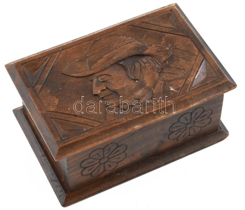 Beschreibung: Koczogh András (1942-): Fadoboz, férfi alakos és virágmotívumos díszítéssel, jelzéssel, szép állapotban, 15x10x7 cm