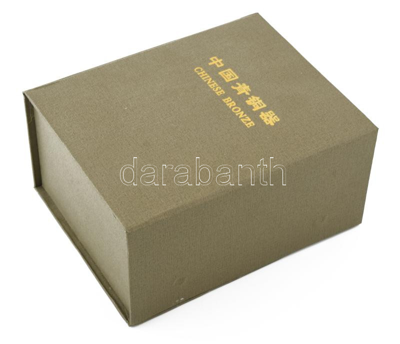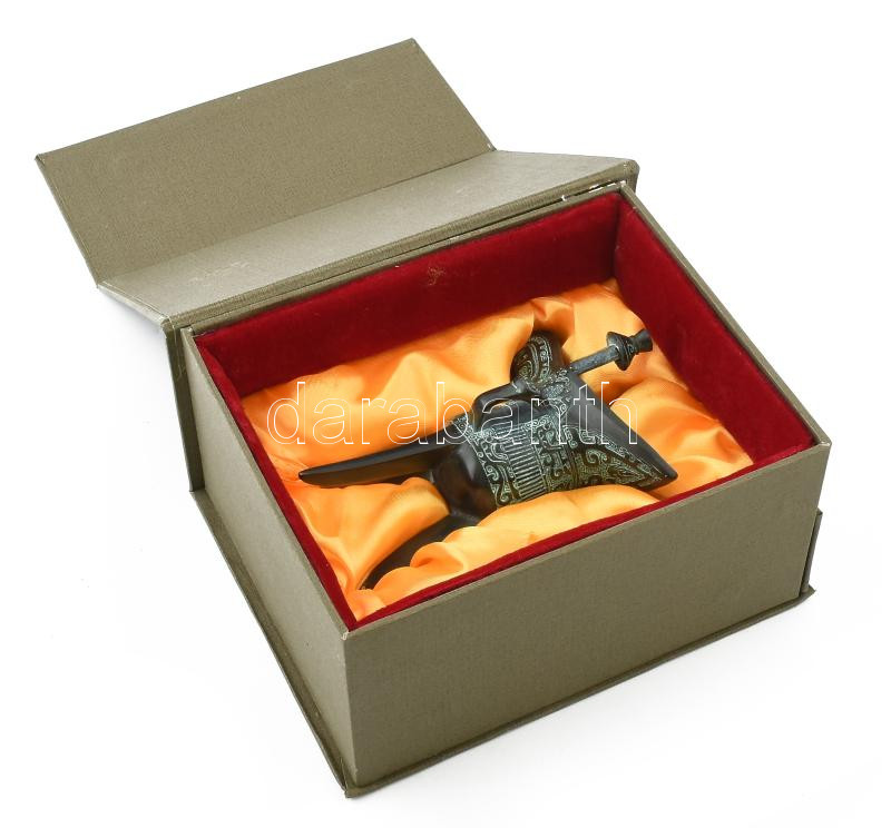 Ókori kínai Shang dinasztia bronz a jue edény gyűjtői másolata. A jue edény, borivásra szolgáló szertartási edény az ókori kínában. Díszdobozban, hozzá feliratos talpazattal 16 cm