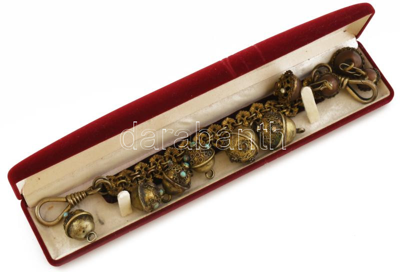 Beschreibung: Pitykegomb készlet, kissé hiányos kövekkel, + felcsatolható réz és bársony ruhadísz 25 cm nem hozzávaló tartóval