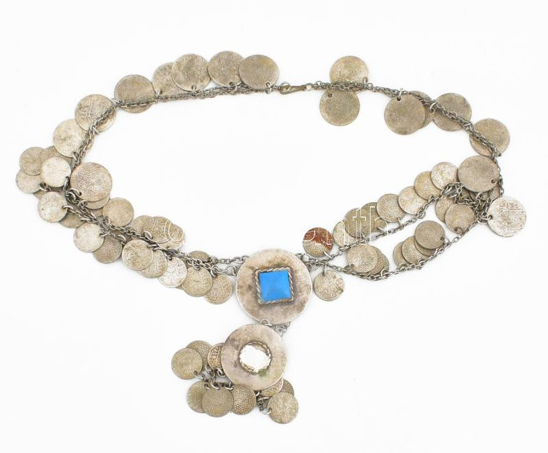Beschreibung: Török ezöst nyaklánc, pénzekkel és kerámia medállal, egy kő hiánnyal. 48 g