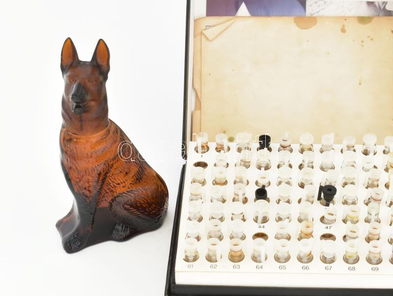 Beschreibung: 2 doboz parfüm minta, közte értékes márkák, hiányos + kutya alakú parfümös üveg, m: 14 cm