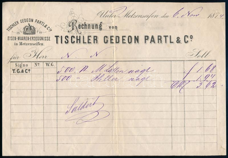 1874 Mecenzéf (Metzenseifen), Tischler Gedeon Partl & Co. fejléces... https://www.darabanth.com/de/444-Fernauktion/444.0/Kunst-Dokumente-andere-Sammelgebiete/Dokument~500022/1874-Mecenzef-Metzenseifen-Tischler-Gedeon-Partl-Co-fejleces-szamla~II2928151