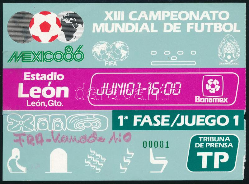 1986 Mexikói foci VB belépőjegy (francia-kanadai meccs) https://www.darabanth.com/de/444-Fernauktion/444.0/Kunst-Dokumente-andere-Sammelgebiete/Dokument~500022/1986-Mexikoi-foci-VB-belepojegy-francia-kanadai-meccs~II2932781