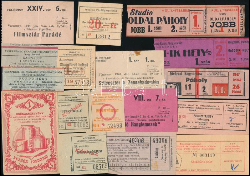 Beschreibung: Vegyes jegy tétel (színházi, mozi, fürdő, stb.), 17 db