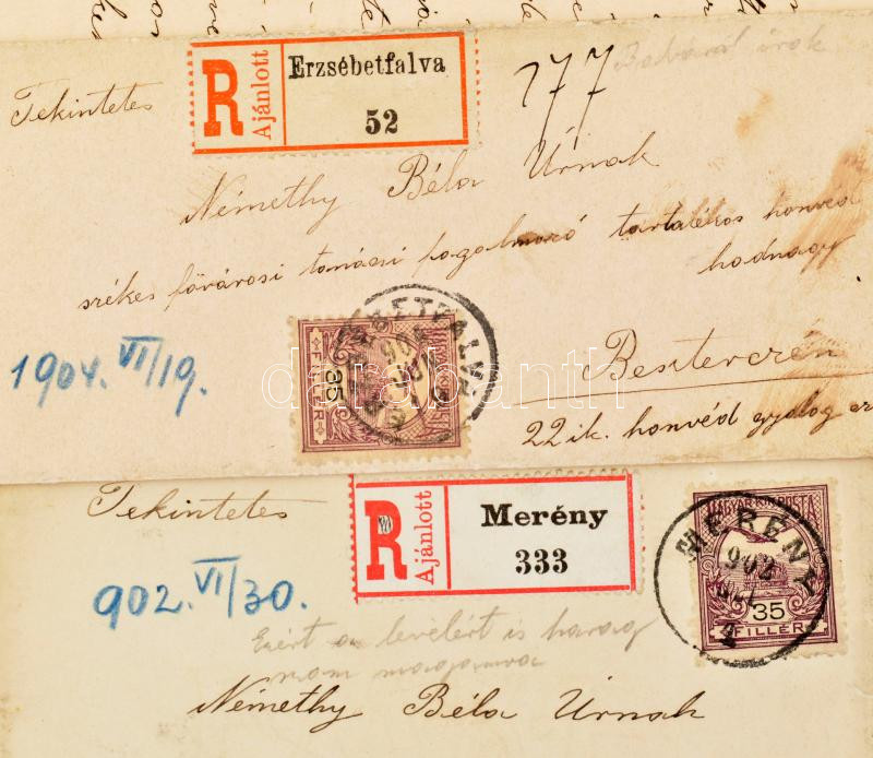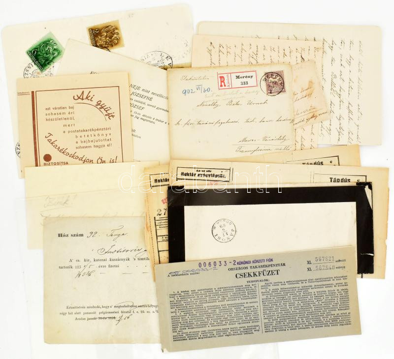 Beschreibung: Vegyes papírrégiség tétel: esküvői meghívó, csekkfüzet, gyászjelentés, levelek, Léva (Felvidék) visszatért bélyegzések, stb.