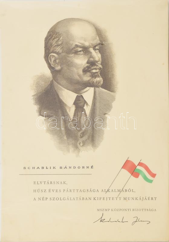 cca 1965-70 Schablik Sándorné, Schablik Sándor tanácsköztársasági forradalmár, munkásőr parancsnok felesége részére kiállított emléklap húsz éves párttagság alkalmából, Kádár János nyomtatott aláírásával, 29,5x21 cm /