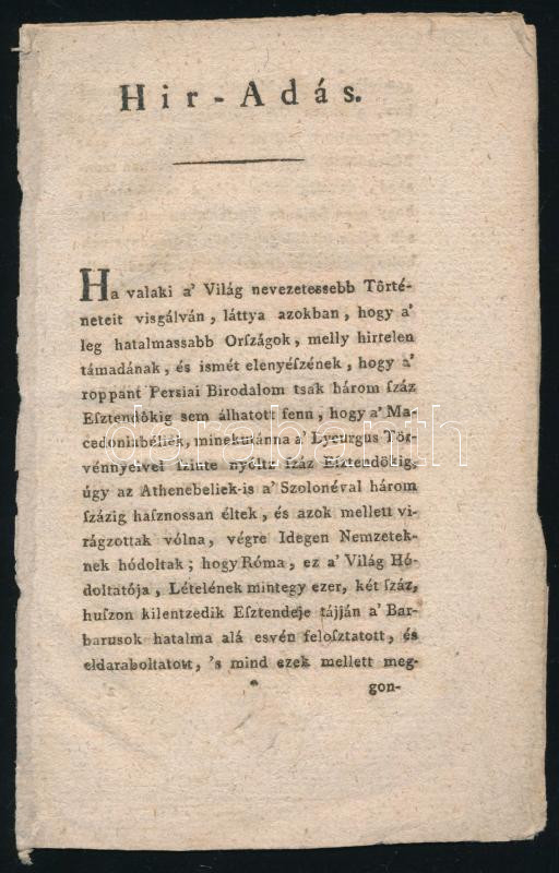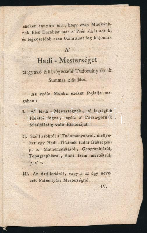1807 Hir-Adás, a [Jung János]: A' Hadi-Mesterséget tárgyazó szükségesebb Tudományoknak summás Elő- adását c. kiadványának ismertetése, benne a könyvesboltok listájával, az utolsó oldalon német nyelvű szöveggel, 5 sztl. lev. Az ismertető apropója, hogy 1807-ben két hasonló munka is megjelent, a [Szekér Joákim Alajos"] Hadi Tudomány" a rivális Hartleben kiadónál, és a "A' Hadi-Mesterség" a Eggenberger kiadónál. A két kiadvány, pedig nem összekeverendő.