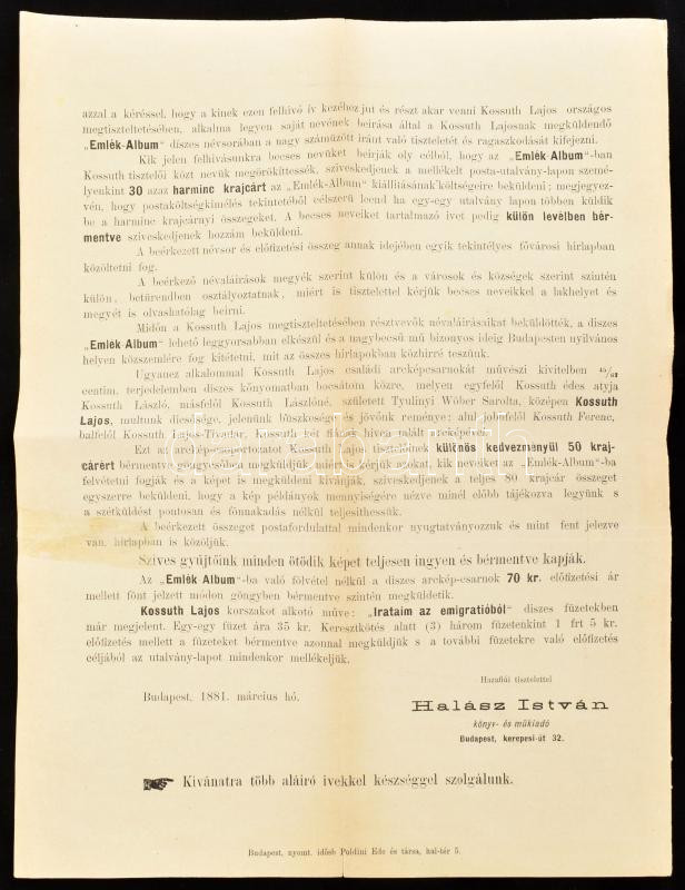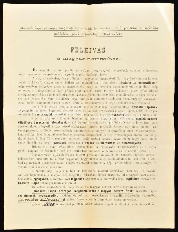 Beschreibung: 1881 Kossuth Lajos 80. születésnapja alkalmából felhívás a magyar nemzethez emlékalbumban való megjelenésre. Kis ragasztással