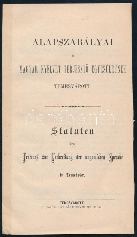 1884 Alapszabályai a Magyar Nyelvet Terjesztő Egyesületnek Temesvárott... https://www.darabanth.com/de/444-Fernauktion/444.0/Kunst-Dokumente-andere-Sammelgebiete/Drucksachen~1500007/1884-Alapszabalyai-a-Magyar-Nyelvet-Terjeszto-Egyesuletnek-Temesvarott-Csanad-egyhazmegyei-ny~II2799720