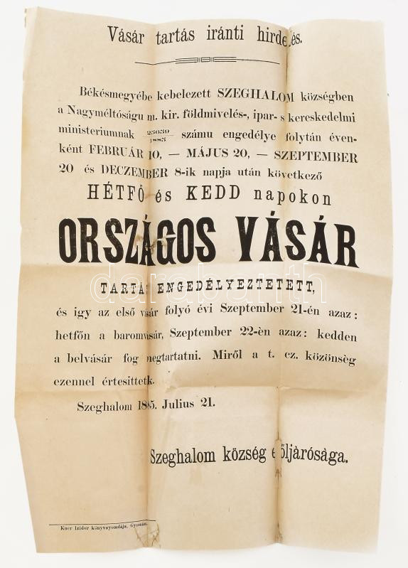 1885 Szeghalom. Országos vásár tartásáról szóló hirdetmény 30x45 cm Ha... https://www.darabanth.com/de/444-Fernauktion/444.0/Kunst-Dokumente-andere-Sammelgebiete/Drucksachen~1500007/1885-Szeghalom-Orszagos-vasar-tartasarol-szolo-hirdetmeny-30x45-cm-Hajtva~II2934177
