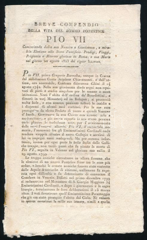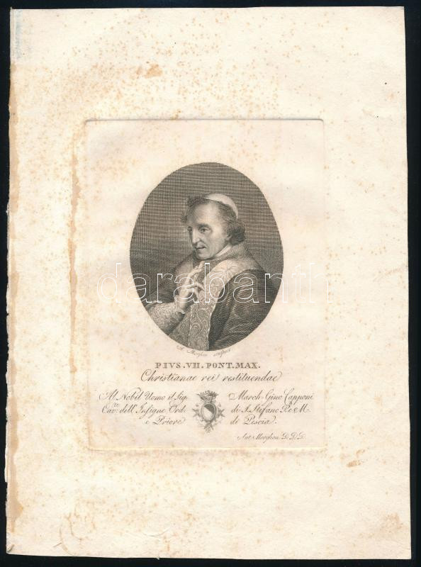cca 1825-1850 Morghen, Antonio (1788-1863): VII. Piusz pápa portréja. Rézmetszet, papír, jelzett a metszeten. Kissé foltos, 16x11,5 cm (lapméret: 27x19,5 cm) + VII. Piusz pápa életrajzának összefoglalása, latin nyelven, 4 p.