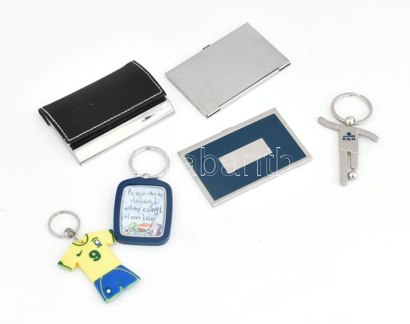 Beschreibung: 3 db szép állapotú fém névjegykártya tartó + 3 sport és reklám kulcstartó
