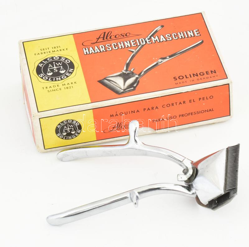 Alcoso hajvágó gép Solineni acél jelzett, eredeti dobozában https://www.darabanth.com/de/444-Fernauktion/444.0/Kunst-Dokumente-andere-Sammelgebiete/Flohmarkt~500016/Alcoso-hajvago-gep-Solineni-acel-jelzett-eredeti-dobozaban~II2925368